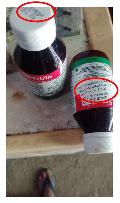 La marca es una que tradicionalmente usó la Coordinación Nacional de Control de Vectores para el control de T. infestans. En el frasco acostado se ve un sticker donde la “recomendación de uso dice hasta el 17-2-2022”, es decir venció hace casi 2.5 años. Ahora, esta fecha (2022) en realidad es una extensión al vencimiento original registrado por la empresa que produce el producto, que se puede ver en el frasco parado de la izquierda que dice “01/19”, es decir vencimiento oringinal de hace casi 6 (seis) años. Este es el insecticida que se está usando en esta provincia para “controlar” al principal vector del parásito que produce la enfermedad de Chagas.